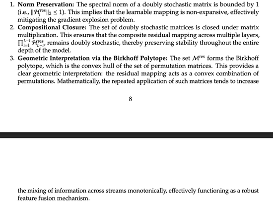 第二是组合封闭:多个双随机矩阵相乘的结果仍然是双随机矩阵,因此无论网络多深,跨层的复合映射都能保持稳定性。