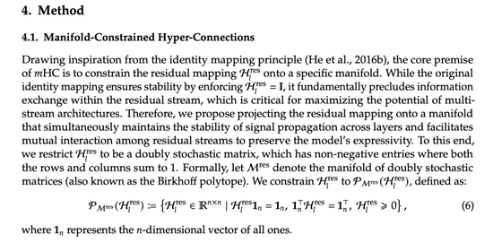 DeepSeek论文的核心思路是将残差映射矩阵约束到一个特定的流形上,一个由双随机矩阵构成的Birkhoff多面体。