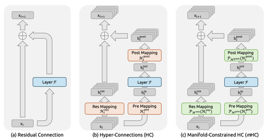 近期出现的Hyper-Connections(HC)试图打破这一格局。HC将残差流的宽度从C维扩展到n×C维,并引入三个可学习的映射矩阵来管理信息流动。