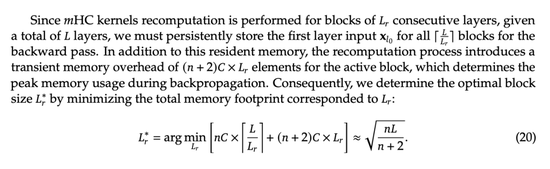 论文还给出了重计算策略的优化公式。对于L层的网络,最优的重计算块大小约为: