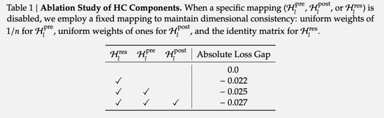 DeepSeek团队的实验表明,在这三个映射中,负责残差流内部信息交换的Hres矩阵贡献了最显著的性能提升。